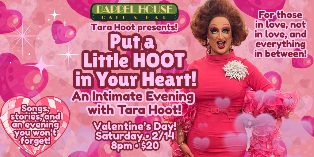 Drag Queen, Tara Hoot, will have songs, stories, and more--all with her signature wit and glamorous charm! Only at Barrel House! Tasty bites and cocktails mixed with Tara Hoot's signature je ne sais quois (that's French for je ne sais quios!) will make this Valentine's Day one you won't soon forget!