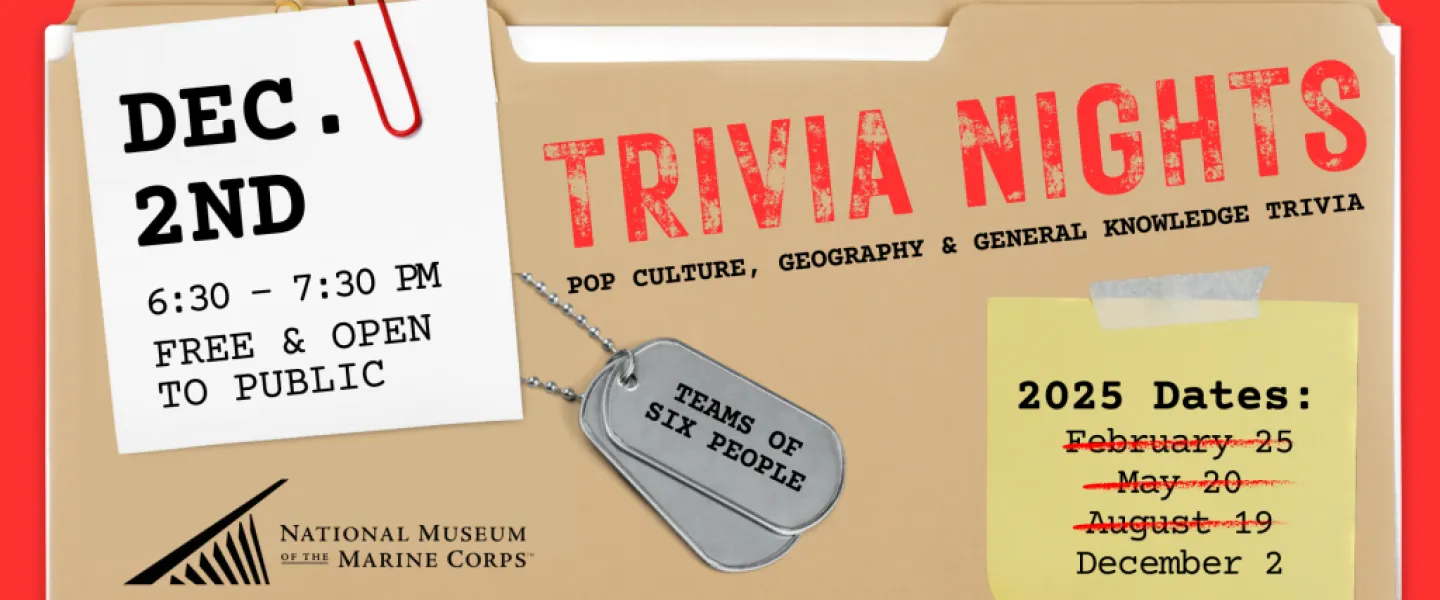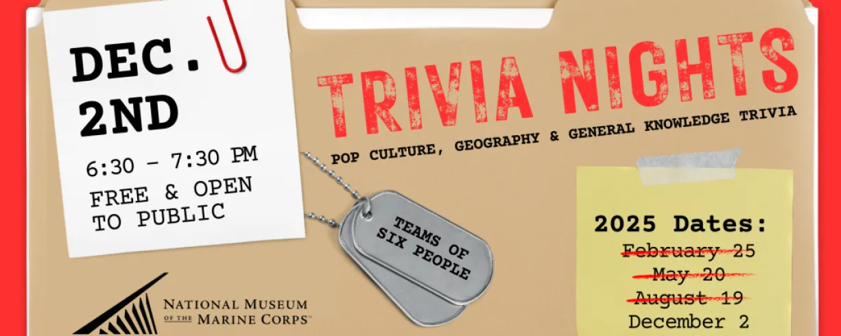 Trivia Nights at Tun Tavern is the perfect opportunity to test your knowledge and compete for the top spot. Gather your strongest team of up to six members and join us at the National Museum of the Marine Corps for a fun-filled evening of trivia covering pop culture, geography, and general knowledge, complete with an engaging bonus round. Doors open at 6:00 PM, and the trivia fun runs from 6:30 to 7:30 PM. No registration is required—just bring your team, grab a drink, and prepare to showcase your knowledge. It’s free and open to the public, and you can also enjoy Tavern menu specials while you play. Think you can outsmart the competition? We look forward to seeing you at Tun Tavern!