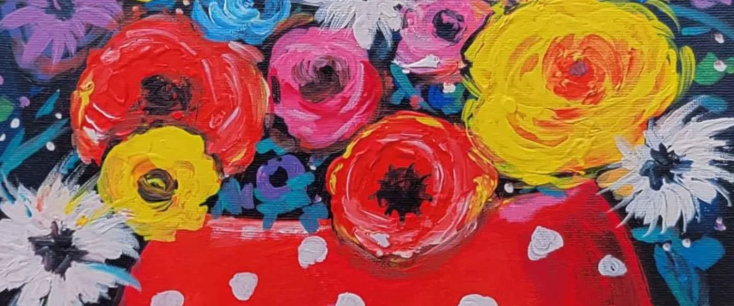 Create a bold and joyful floral scene featuring a red vase with playful white dots overflowing with bright, colorful flowers. This lively painting celebrates texture, movement, and vibrant color, with plenty of room to make it your own.